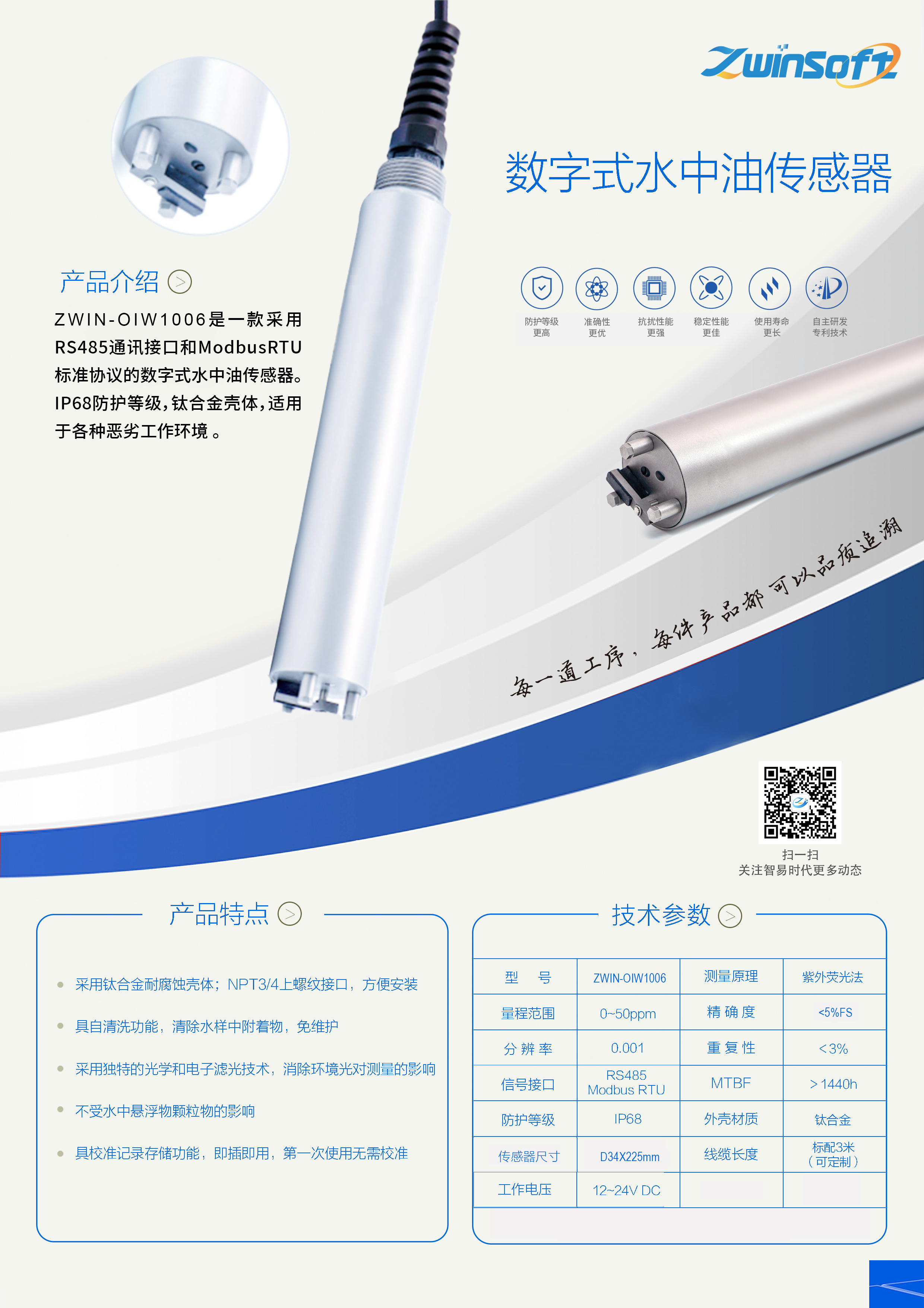 ZWIN-OIW1006是一款采用RS485通訊接口和ModbusRTU標準協(xié)議的數(shù)字式水中油傳感器。IP68防護等級,鈦合金殼體,適用于各種惡劣工作環(huán)境。
