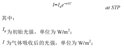 基本原理是Beer-Lambert關(guān)系式,在給定溫度、壓力下,一定光程內(nèi)一定濃度氣體對特定波長的光強的吸收。標(biāo)準(zhǔn)狀況(STP)下的數(shù)學(xué)表達(dá)式為: