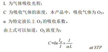 臭氧檢測原理是紫外吸收法,是Beer-Lambert關(guān)系式,在給定溫度、壓力下,一定光程內(nèi)一定濃度氣體對特定波長的光強的吸收。標(biāo)準(zhǔn)狀況(STP)下的數(shù)學(xué)表達(dá)式為: