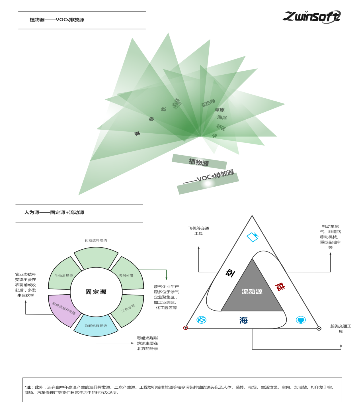 人為源包括流動源——車、船、飛機(jī)等交通工具相關(guān)的排放和固定源——化石燃料和生物質(zhì)(秸稈、木材)燃燒、溶劑使用、工業(yè)過程(如石油化工、煉鋼煉焦)等。